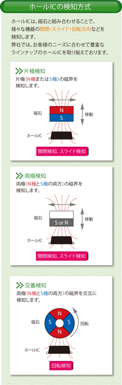 上述したような問題を一挙に解決できる技術が、「ホールIC」です。 ホールICとは、半導体センサーによって磁気の強さを電気信号に変換するICのことです。磁気検知の方式として、「片極検知型」「両極検知型」「交番検知型」の3タイプがあり、それぞれの方式を採用したホールICには、次のような特徴があります。