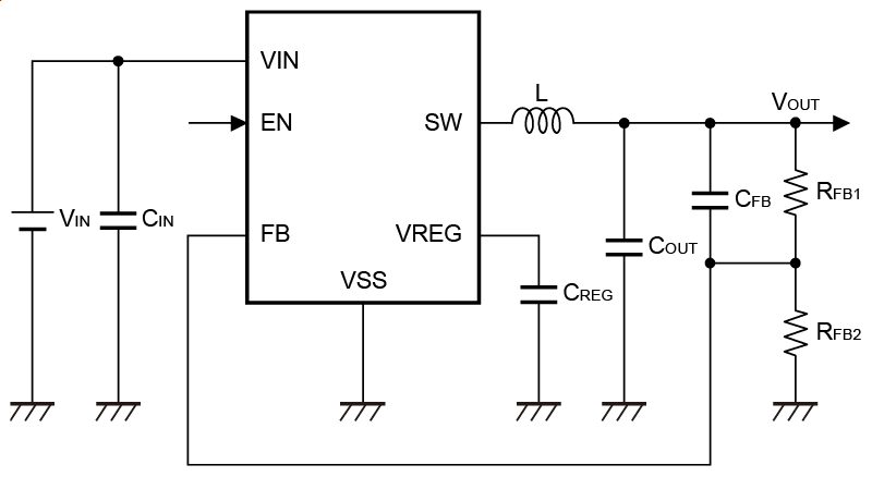 同期整流回路内蔵により、従来の降圧型スイッチングレギュレータに比べ高効率化がしやすく、また、過大な負荷電流からICやコイルを保護する過電流保護回路、発熱による破壊を防止するサーマルシャットダウン回路が内蔵されています。