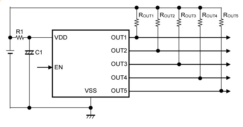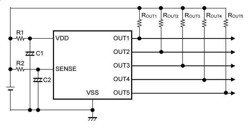 入力電圧が5つの検出電圧値以上の場合、VOUT1 = VOUT2 = VOUT3 = VOUT4 = VOUT5 = VSSとなります。