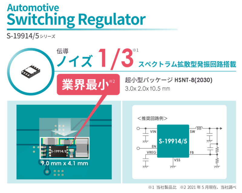 「S-19914/5シリーズ」は、36V入力(定格45V)、1A出力電流、低EMI、125℃動作、発振周波数2.2MHz、同期整流の業界最小の車載用降圧型スイッチングレギュレータとなっています。
