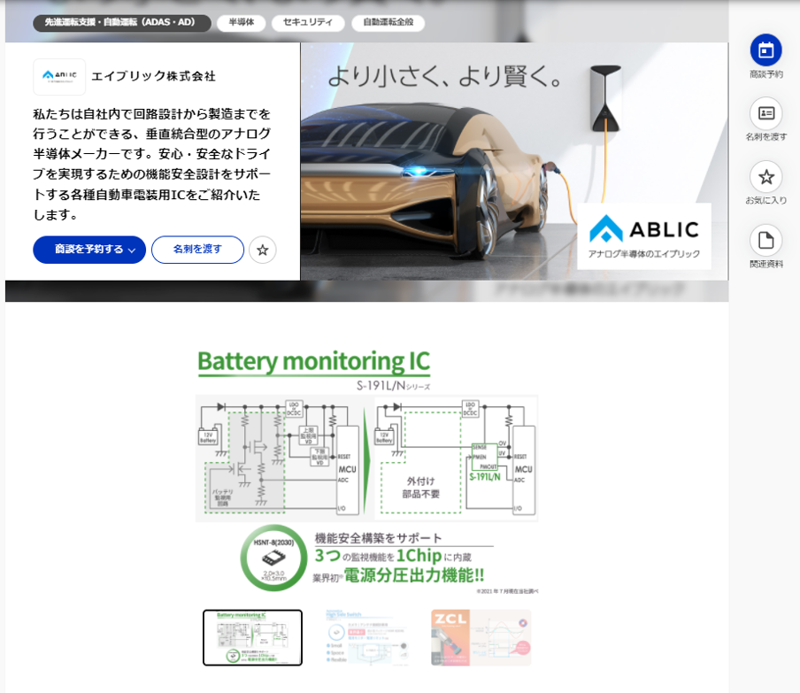 ・車載用 高耐圧バッテリーモニタリングIC S-191L/Nシリーズ ・車載カメラ/アンテナ接続診断用 ハイサイドスイッチ S-19682/3シリーズ ・車載用 スイッチングレギュレータ S-19914/5シリーズ ・車載用 ZCLホールIC S-57TZ Sシリーズ