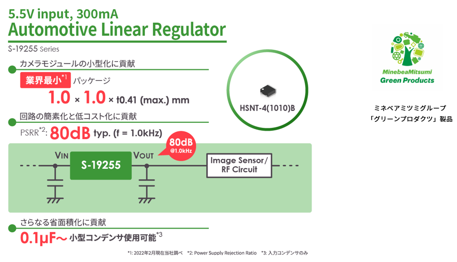 「S-19255シリーズ」は、5.5V動作300mA出力の車載LDOリニアレギュレータとして業界最小パッケージサイズのHSNT-4(1010)Bを採用しました。これによりカメラモジュールなどの小型化に貢献します。
