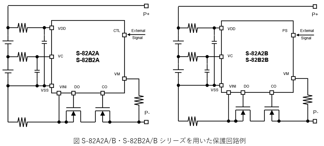 CTL端子に外部から信号を入力することで充放電制御機能が働き、電池パックは充放電禁止状態になります。CTL端子にPTCサーミスタを接続することで過熱保護機能を実現できます。 - パワーセービング機能により、消費電流を抑えることが可能(S-82A2B・S-82B2Bシリーズ)