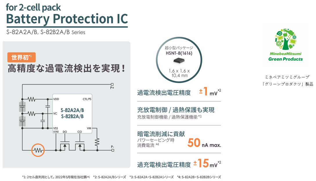 ミネベアミツミグループのエイブリック株式会社(社長:石合 信正、本社:東京都港区、以下:「ABLIC」)は本日より、2セル直列用としては世界初(※1)となる、外付けの電流検出抵抗を用いて高精度な過電流検出を実現した2セル直列用バッテリー保護IC「S-82A2A/B・S-82B2A/Bシリーズ」の販売を開始しました。