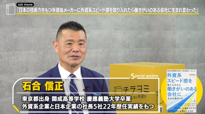当社の代表取締役社長 兼 CEO石合信正著『日本の技術力をもつ半導体メーカーに外資系スピード感を取り入れたら働きがいのある会社に生まれ変わった』が、ビジネス動画プラットフォーム「チラヨミ」で紹介されました。