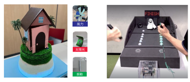 展示作品(左:再生可能エネルギーで発電させクイズに回答していくゲーム 右:振動による発電量を競う対戦ゲーム)
