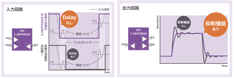 「S-34HTS08AB」は、入力回路・出力回路に通信波形を制御する回路を搭載。周辺デバイスとの高速かつ安定した通信に貢献します。