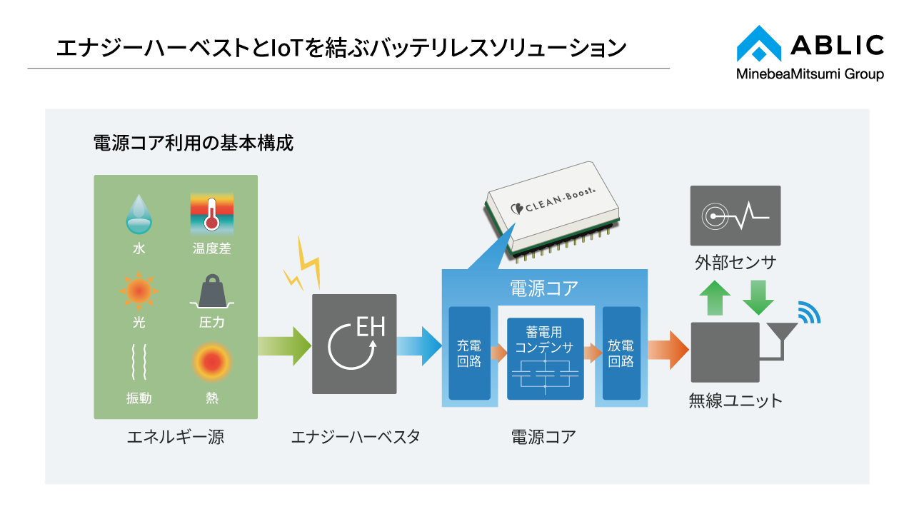 CLEAN-Boostは、水に加えて、振動や温度差を利用する環境発電技術も取り入れて展開する見込みだ。環境発電向け電源ソリューション(電源コア)の商品化に加え、共同開発を行うパートナー企業を増やし、市場創出にも力を入れる。