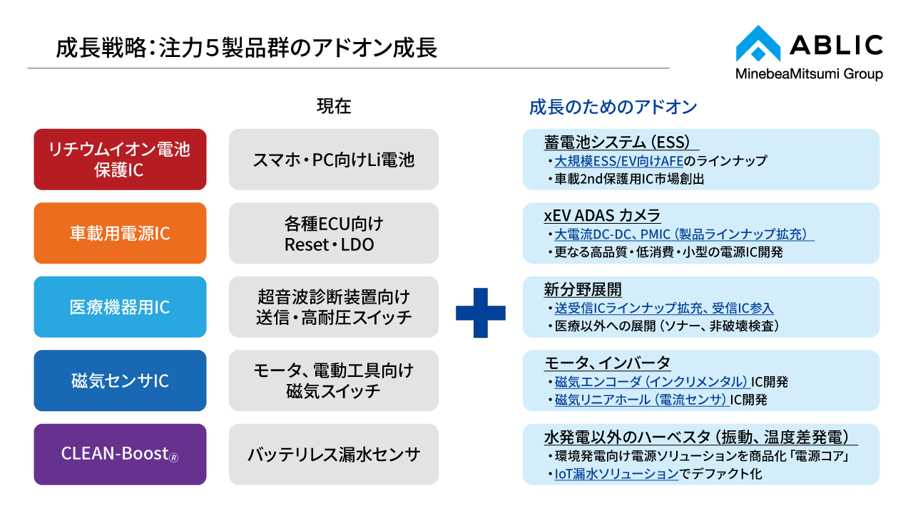 具体的には、リチウムイオン電池保護IC車載用電源IC医療機器用IC磁気センサIC、及び当社独自のエナジーハーベスト技術「CLEAN-Boost))」の5製品群に注力する。従来から手掛けてきた分野だが、アナログおよびミックスドシグナル技術を活用して“プラスアルファ”の機能を追加し、高付加価値化を追求する。“プラスアルファ”の部分をわれわれは「成長のためのアドオン」と呼んでいる。このアドオンにより、お客様の実装基板上において当社製品が占める割合を増やすことが基本的な狙いになる。