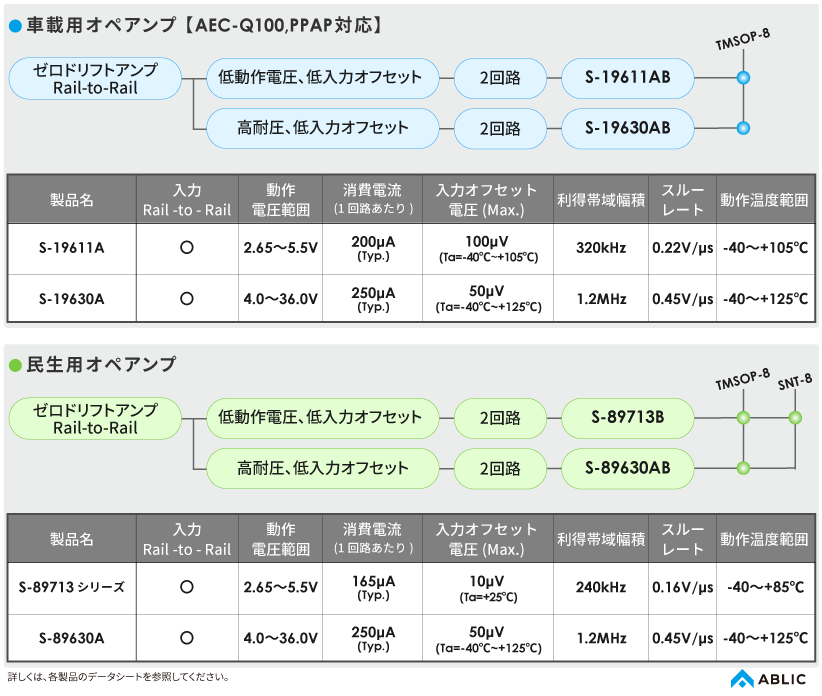 エイブリックは、民生用のゼロドリフトアンプとしてS-89630AとS-89713シリーズを、車載用のゼロドリフトアンプとしてS-19630AとS-19611Aをラインアップしています。