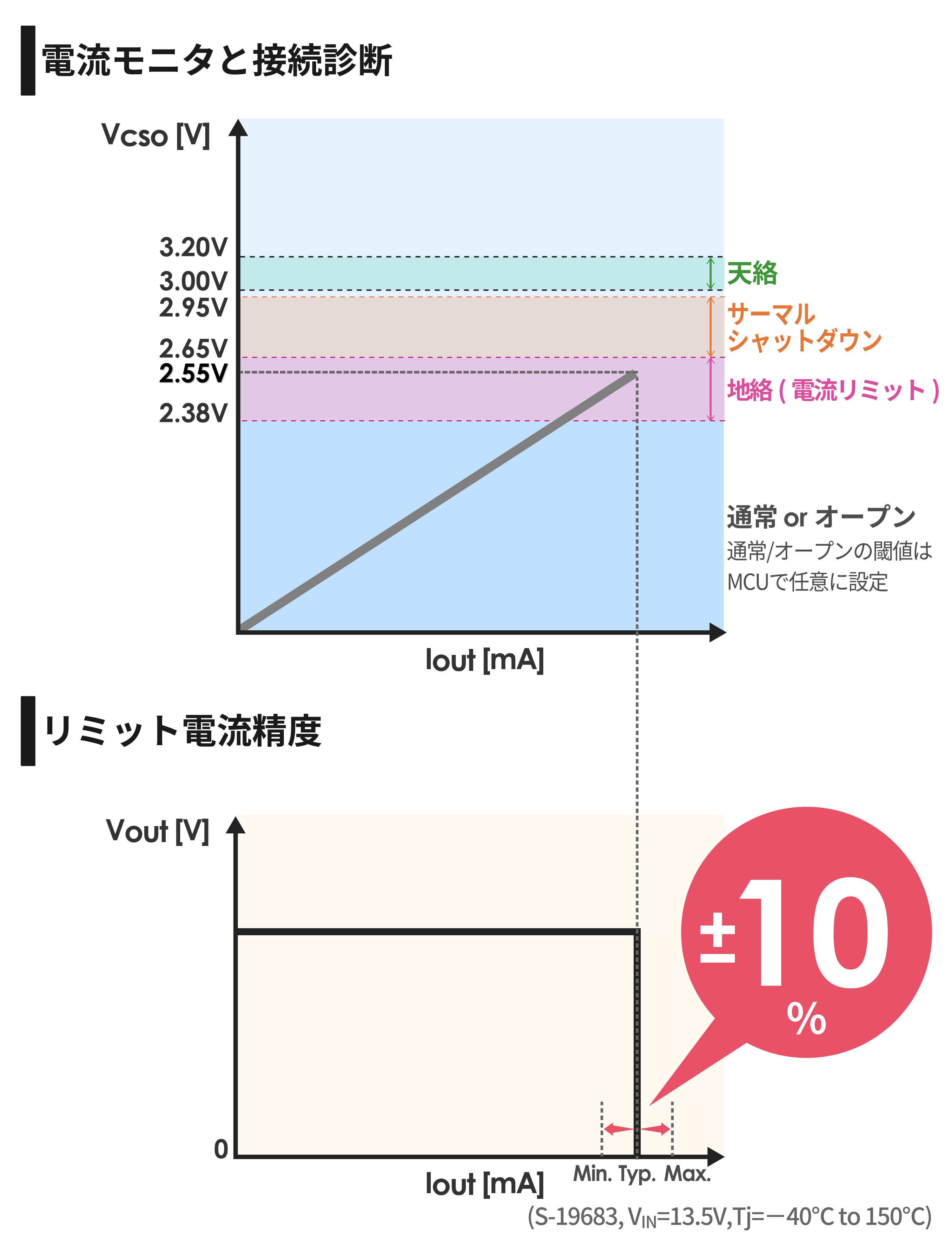 S-19682/3シリーズは、負荷電流に比例した電圧を出力するCSO端子を備えています。 CSO端子は状態出力端子も兼ねるため、MCUでCSO端子電圧をモニタするだけで、カメラ/センサ/アンテナ等の電流モニタと接続状態診断(オープン、通常、地絡、天絡)が可能です。