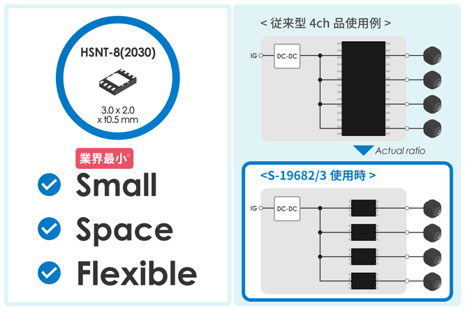 36V入力、600mA出力電流、電流モニタ機能付き1chのハイサイドスイッチを、業界最小※のパッケージHSNT-8(2030)に。