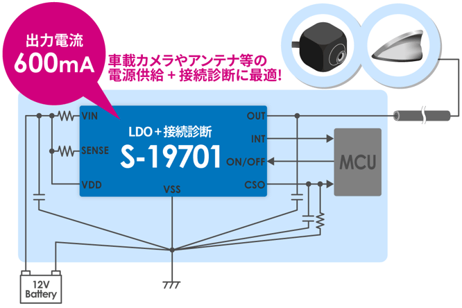 車載カメラやV2Xのアンテナの接続状態の診断には、接続診断IC S-19701シリーズが最適です。