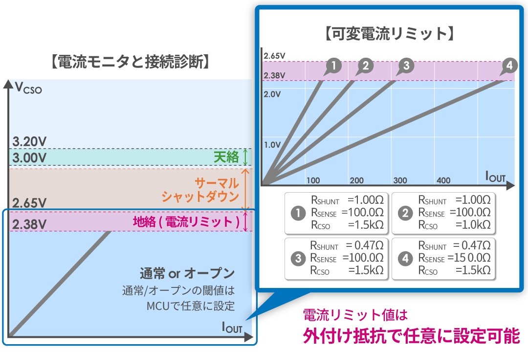 - 電流モニタ機能を利用することで、MCUがオープン・通常・地絡・天絡等の接続状態を診断可能。