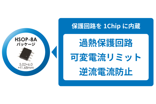 LDOレギュレータ機能・接続状態診断機能に加え、過熱保護回路、可変電流リミット、逆流電流防止機能の3つの保護回路も内蔵。更に過電圧検出回路も搭載しています。
