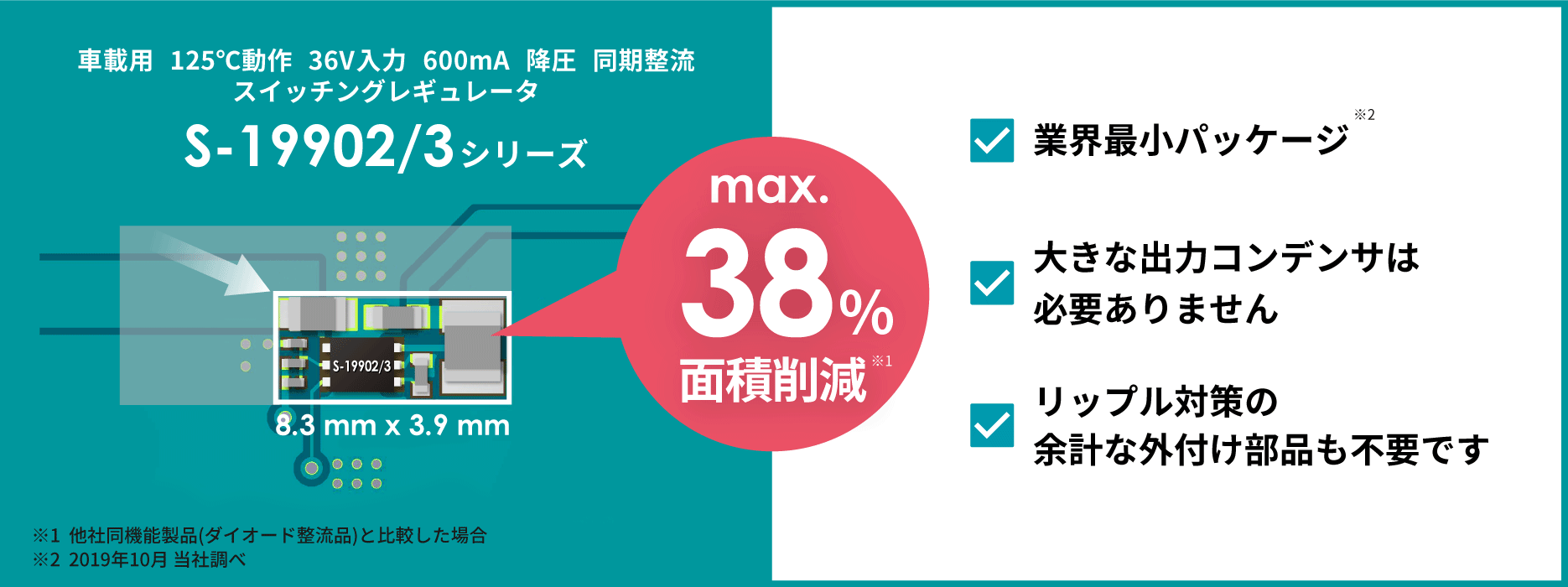 バッテリーに直結可能な36V入力、125℃動作、同期整流の車載品質スイッチングレギュレータ(DC-DCコンバータ)を、業界最小*のパッケージ(2.46mm x 1.96mm)に。