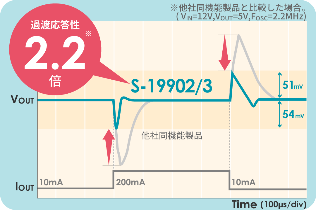 高速過渡応答を実現するために、S-19902/3シリーズはスロープ補償回路や位相補償回路を最適化。