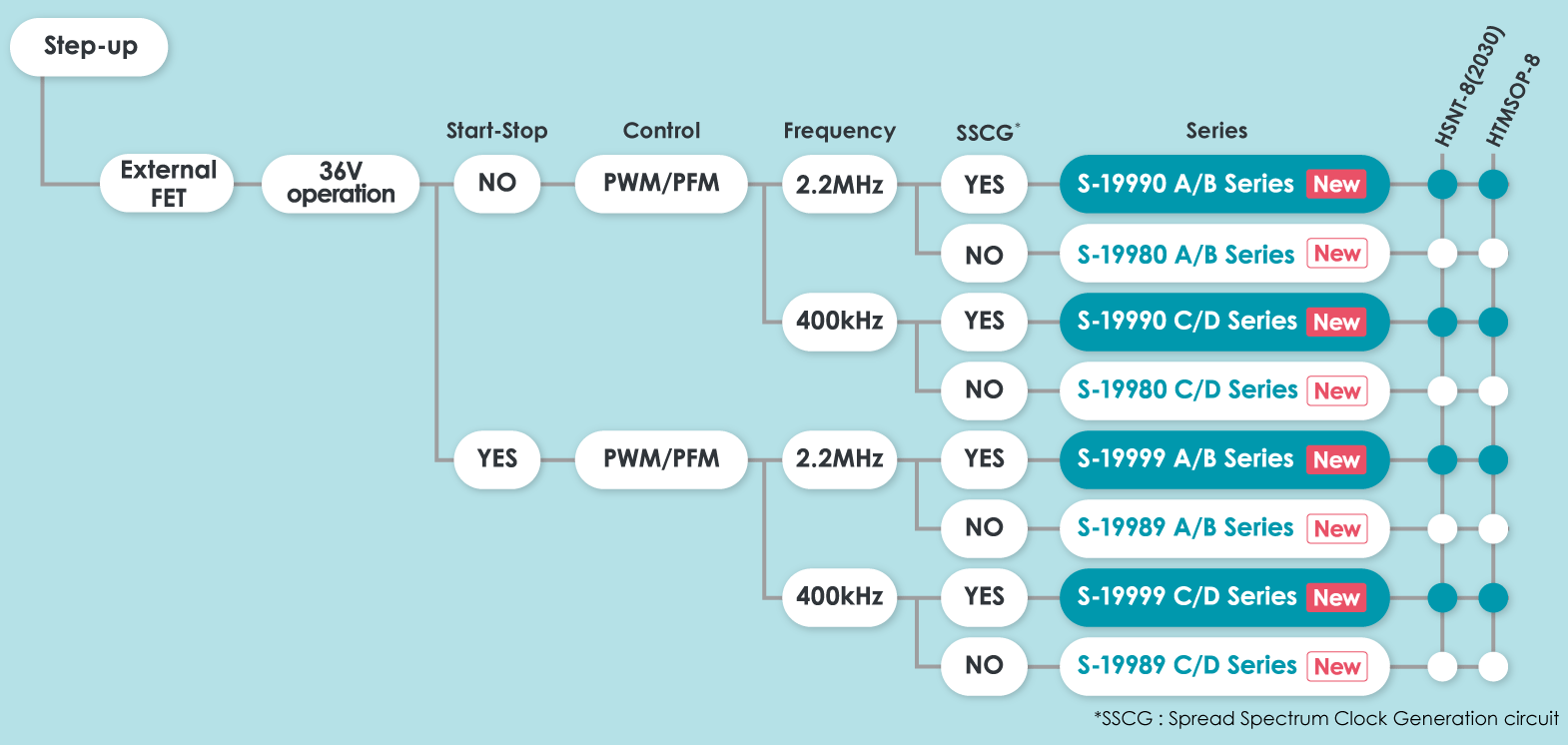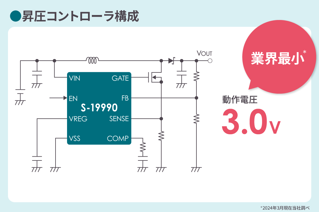 S-19990シリーズは、36V動作の昇圧スイッチングレギュレータコントローラとして業界最小*動作電圧3.0Vを実現。