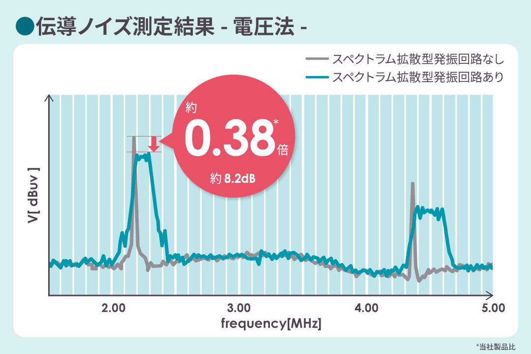 S-19990/9シリーズは、伝導ノイズおよび放射ノイズを低減するスペクトラム拡散型発振回路を搭載しているため、システムのEMI低減が可能です。これにより、伝導ノイズは約0.38倍に低減できます。