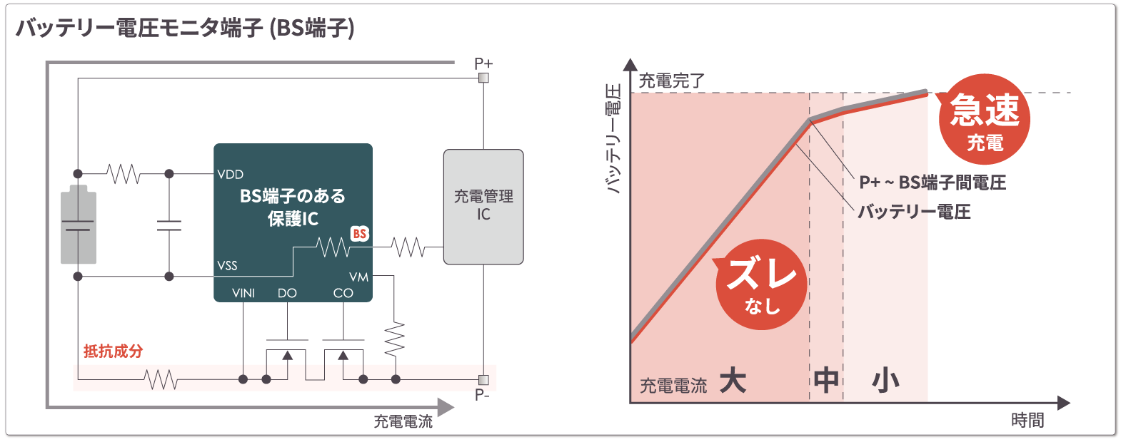 充電管理IC (充電器) はP+ ~ P-間電圧をモニターして充電制御をしています。VSS ~ P-間には、過電流センス抵抗やFETのオン抵抗といった抵抗成分があるため、充電電流によってVSS ~ P-間には必ず電位差が生じます。最適な充電制御が難しくなり、充電時間が長くなります。