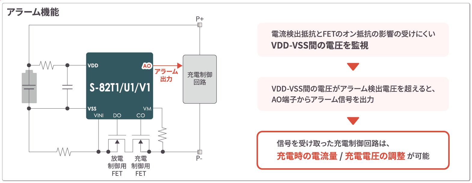 急速充電中でもバッテリー電圧を高精度で検出し、アラーム信号を出力する機能です。