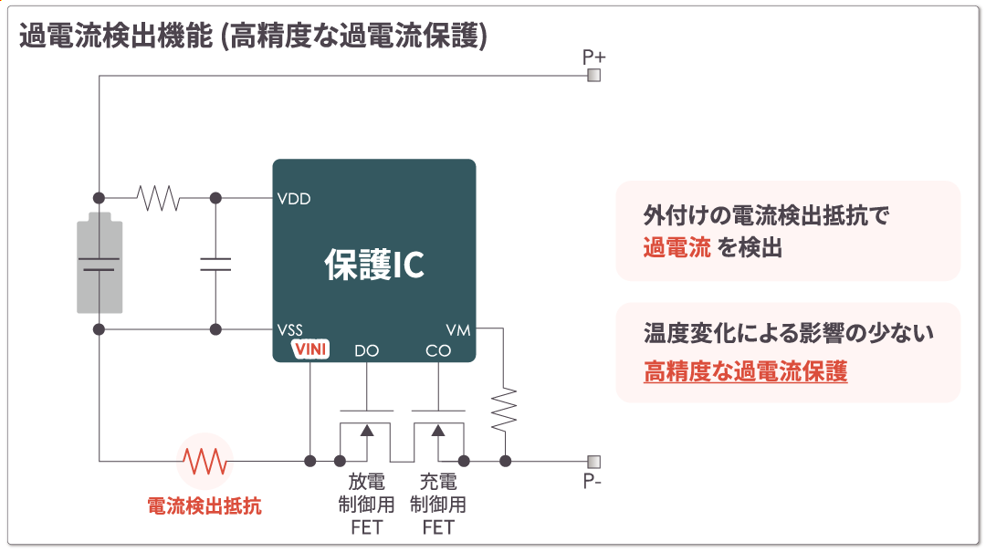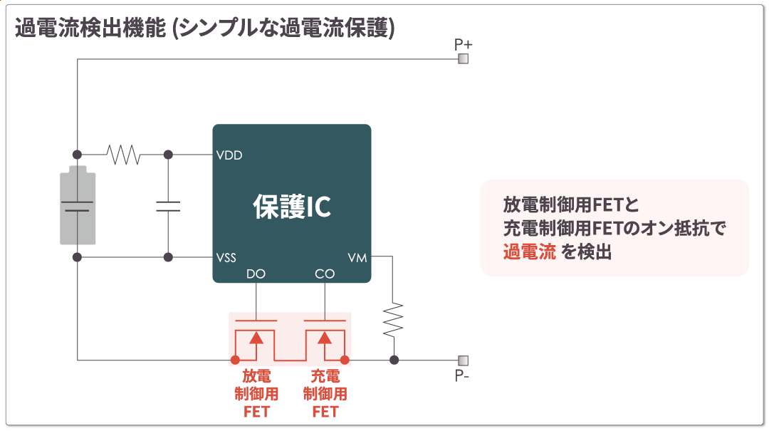 外付けの電流検出抵抗を使用せず、放電制御用FETと充電制御用FETのオン抵抗を用いることで、シンプルな過電流保護を実現します。