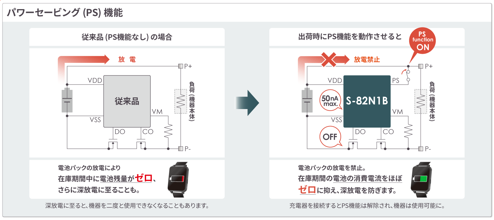 • ・パワーセービング機能を備えた製品を使うことで製品出荷後の在庫期間の電池消耗を大幅に低減することが可能です。