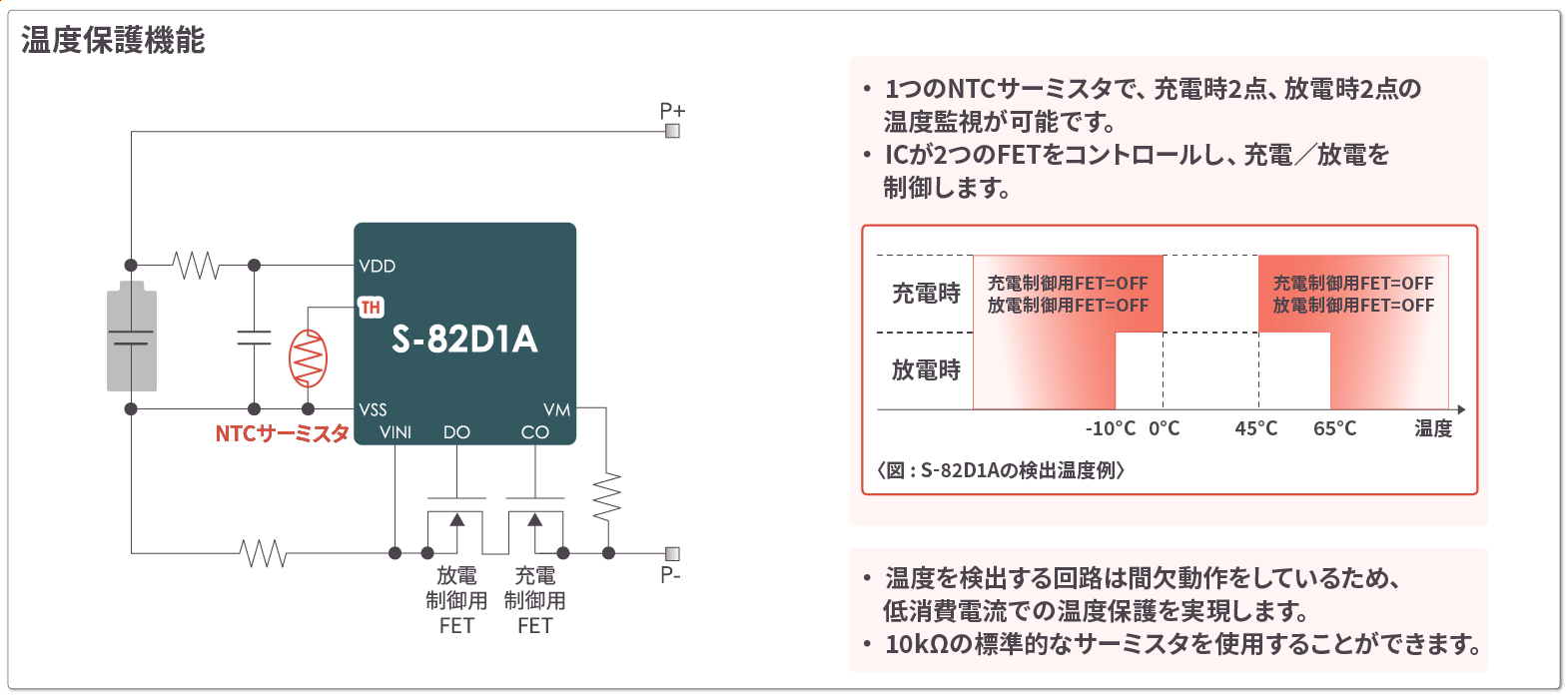 外付けのNTCサーミスタを用いて、温度の監視と充電 / 放電の制御を行う機能です。