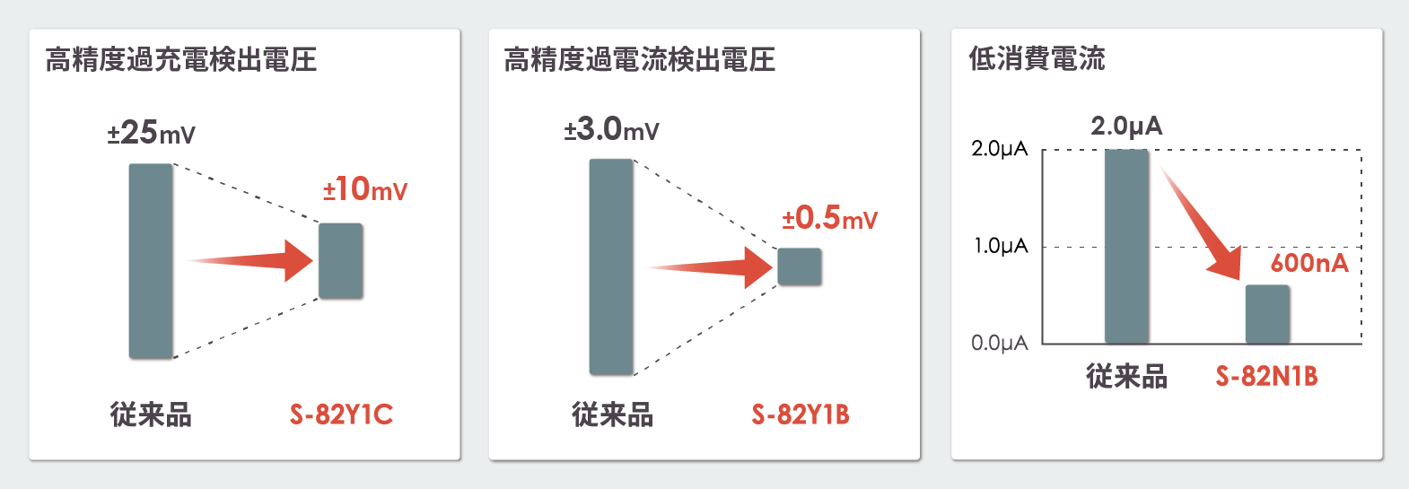 • ・小容量のリチウムイオン電池を使用するアプリケーションの消費電流抑制に貢献します。
