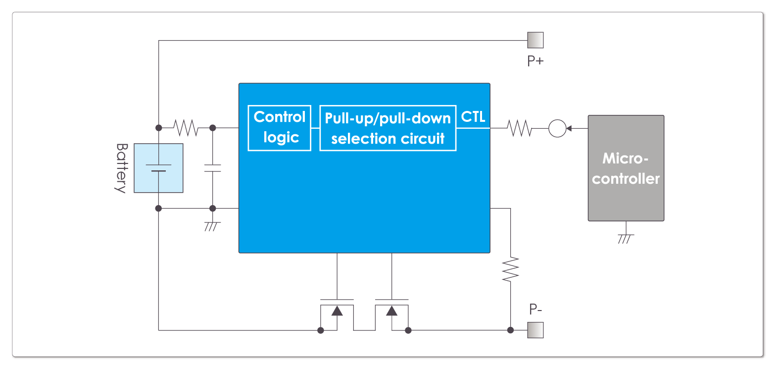 更新日: 2024/10/30 ブロック図 | 関連情報 | 推奨製品 1セル用バッテリー保護回路を構成する際、以下のようなことにお悩みではありませんか? エイブリックはお客様のご要望に応える1セル用バッテリー保護回路をご提案します。 マイコンなどにより外部信号で充放電制御をしたい CTL端子による外部からの充放電制御を可能にする保護回路 ブロック図 バッテリー監視以外にシステム側からの信号で充放電制御FETをオフ / オンする回路構成です。 外付けのセンサやマイコンからの信号で充放電を制御したい場合に適しています。 関連情報 機能説明 : CTL端子機能 本保護回路の推奨製品 外部制御端子を備えた製品をラインナップ 製品名 データシート 特長 オンライン購入 S-82P1A 放電過電流1検出電圧精度 ±0.75mV S-82K1A 放電過電流1検出電圧精度 ±1.0mV S-82F1A 放電過電流1検出電圧精度 ±1.5mV S-82N1A 動作時消費電流 990nA max. タイプ FETセンス 1セル用バッテリー保護IC 用途別回路例 エイブリックの1セル用バッテリー保護IC 1セル用バッテリー保護IC紹介ページへ