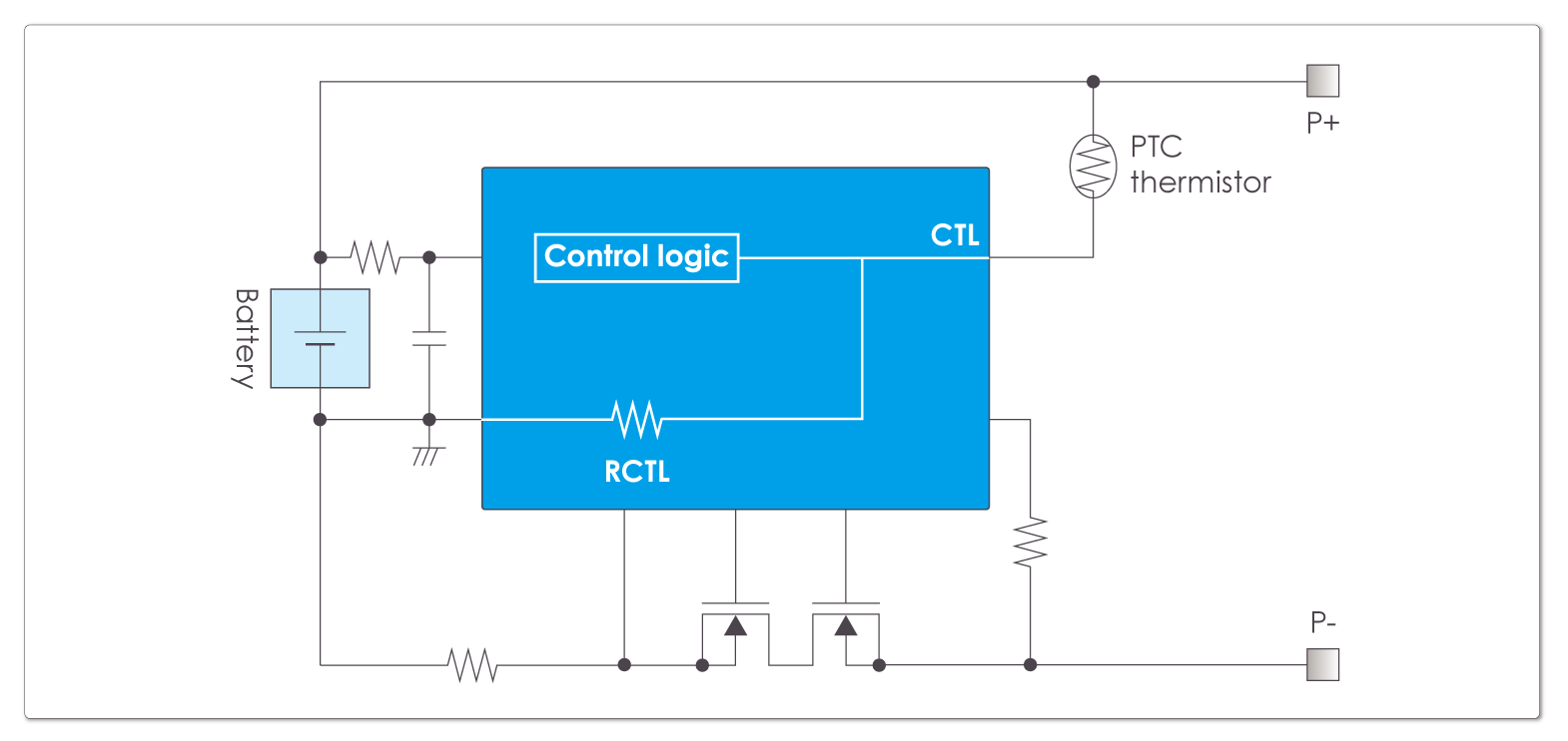 更新日: 2024/10/30 ブロック図 | 推奨製品 1セル用バッテリー保護回路を構成する際、以下のようなことにお悩みではありませんか? エイブリックはお客様のご要望に応える1セル用バッテリー保護回路をご提案します。 PTCによる簡易温度保護回路を構成したい CTL端子による簡易温度検出機能を備えた保護回路 ブロック図 CTL端子にPTCサーミスタを接続することで高温時に充放電制御FETをオフする回路構成です。 高温時に急激に抵抗値が増加する特性を利用することで簡易的な高温保護回路を構成できます。 本保護回路の推奨製品 外部制御端子を備えた製品をラインナップ 製品名 データシート 特長 オンライン購入 S-82P1A 放電過電流1検出電圧精度 ±0.75mV S-82K1A 放電過電流1検出電圧精度 ±1.0mV S-82F1A 放電過電流1検出電圧精度 ±1.5mV S-82N1A 動作時消費電流 990nA max. タイプ FETセンス 1セル用バッテリー保護IC 用途別回路例 エイブリックの1セル用バッテリー保護IC 1セル用バッテリー保護IC紹介ページへ