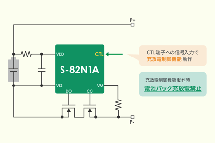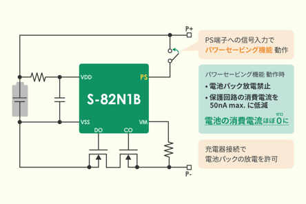 S-82N1Bシリーズは、外部からPS(パワーセービング信号入力)端子に信号入力することで、パワーセービング機能が動作し、電池からの放電を禁止させることが可能。