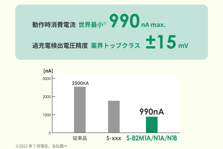 また、同時に保護IC自身の消費電流も50nA max.に抑えることが可能です。