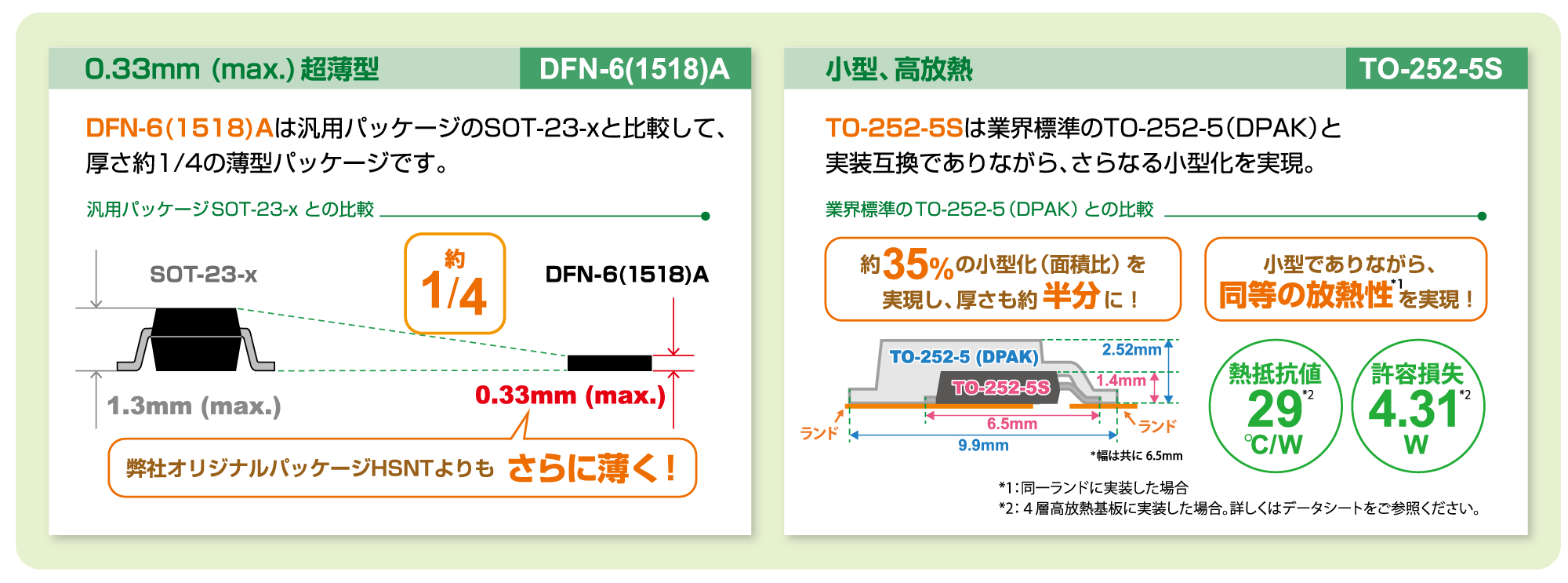 0.8mm角の超小型パッケージや厚さ0.33mm(max.)の超薄型パッケージが高密度実装に貢献します。