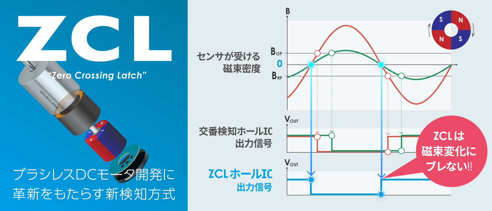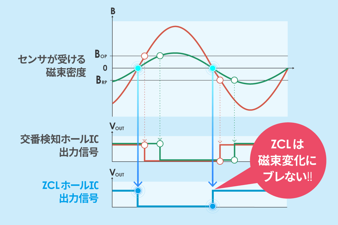 ZCLホールICは、温度変化・磁石とホールIC間の距離変化等により変動してしまう「磁束密度の大きさ」を検知するのではなく、