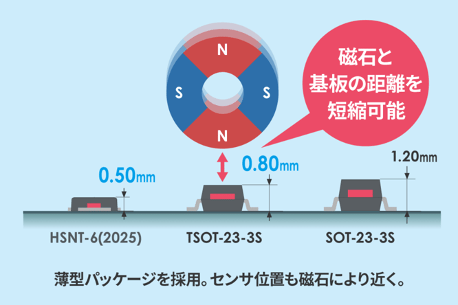 また、世界最薄の新パッケージTSOT-23-3S (2.9 x 2.8 x t0.8mm) なら、業界標準のSOT-23-3 (2.9 x 2.8 x t1.3mm) のフットプリントそのままに磁石と基板の距離を短縮化できます。