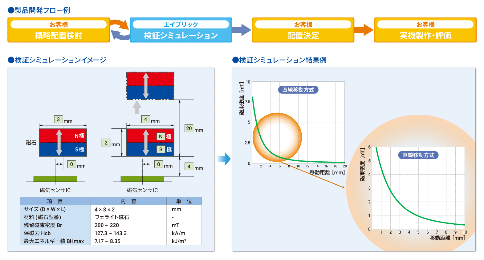 エイブリックでは、お客様の機構にあわせて磁石と弊社磁気センサICの最適な組み合わせをご提案する “磁気シミュレーションサービス” を提供しております。この磁気シミュレーションサービスをご活用いただくことで、試作回数、開発期間、開発費用の削減やより高いコストパフォーマンスが期待できる部品の最適化に貢献いたします。