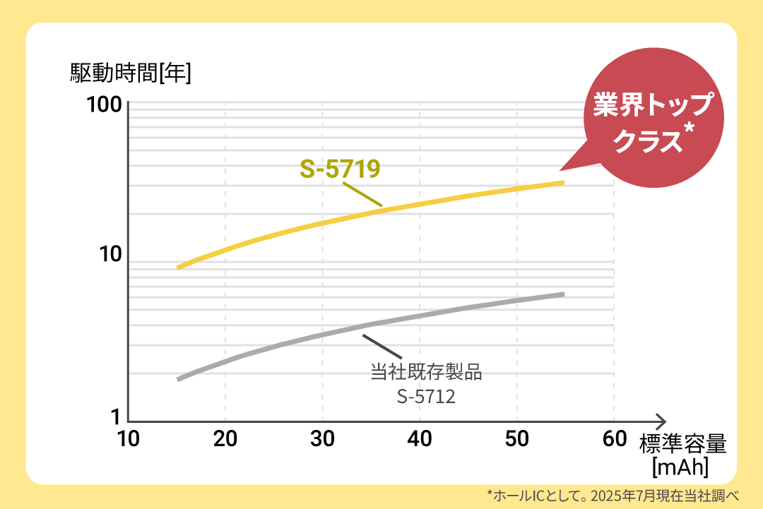 S-5719シリーズは、わずか0.2μA (typ.) という業界トップクラス*の超低消費電流を実現したホールICです。