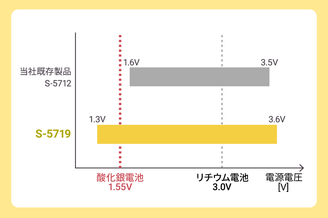 S-5719シリーズは、電源電圧範囲が1.3Vから3.6Vと広範囲です。これにより、一般的なリチウムイオン電池 (約3.0V) はもちろんのこと、酸化銀電池 (約1.55V) のような低電圧で駆動する電子機器にも最適です。