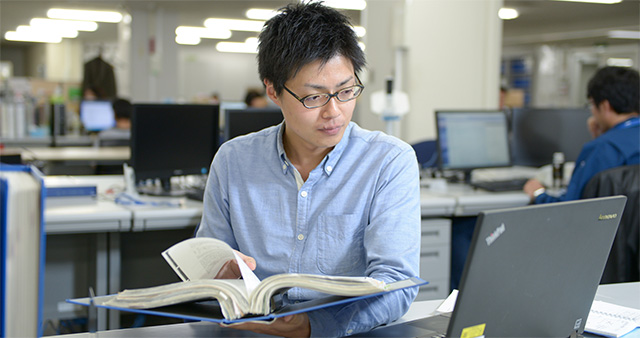新規プロセスの開発は、ひとつひとつのスパンが長いのが特徴です。大体2~3年。まず、過去の文献や特許を調べるフィジビリティスタディを行います。そして試作品の構造設計、工場で試作、測定評価し振り返る。この工程を何度も繰り返します。開発の流れはどのプロセスも、ほとんど変わりませんが、ひとつとして同じように進むものはありません。むしろなかなか思い通りに行かない事のほうがほとんど。まさか、こんなところで!?という箇所で行き詰まっていることも。その分、自分の予測がピッタリと当たった時の達成感は相当なものです。より良いモノを目指す限り、課題はつきもの。それを解決するのは難しいですが、だからこそ新しいことに、常にチャレンジできる楽しさもあります。