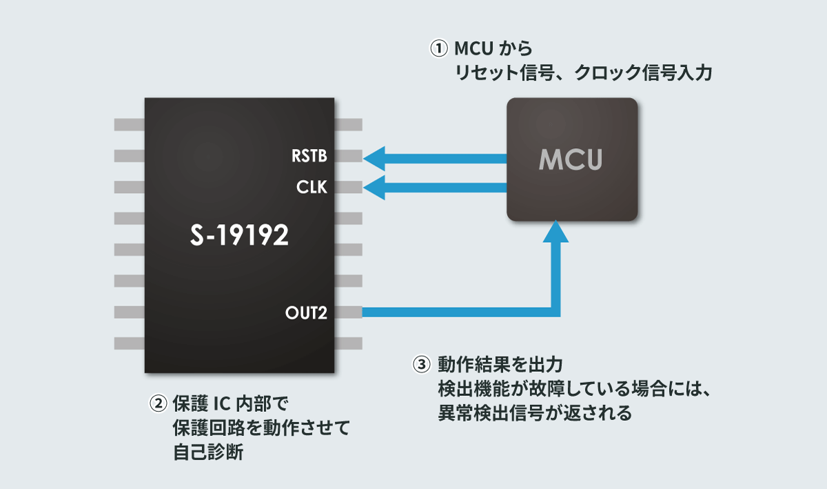 図2は、自己診断機能(セルフテスト)の処理の流れを示す。保護ICに接続するMCUからリセット信号とクロック信号を入力すると、保護IC内部の自己診断回路を介して、過充電、過放電検出回路が動作し、その結果を出力する。異常検出信号が返された場合には、保護IC内部の該当する検出回路が故障していることになる。