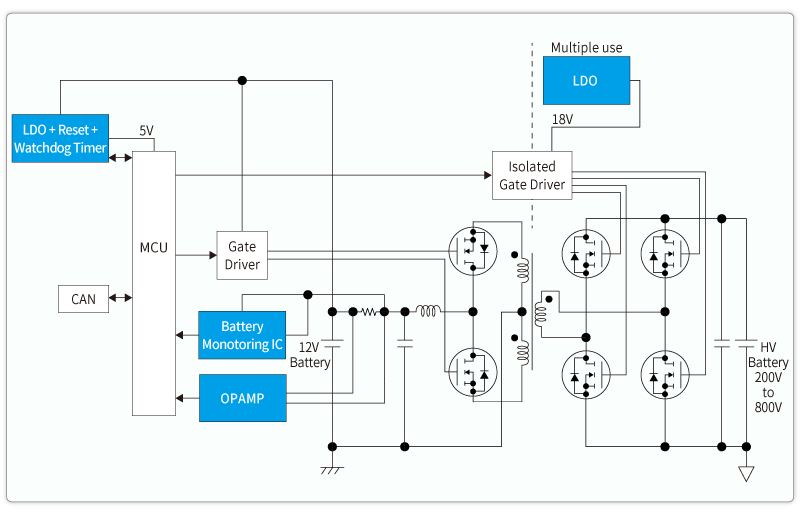 ABLIC has a lineup of LDOs that can output the high voltage required by the gate driver circuit. In addition, our lineup offers LDOs with built-in watchdog timers for monitoring MCUs, battery monitoring ICs used for fast monitoring of abnormal voltages in 12V auxiliary batteries and operational amplifiers ideal for charge current monitoring. With its wide range of products, ABLIC can provide ICs ideal for DC/ DC converters.