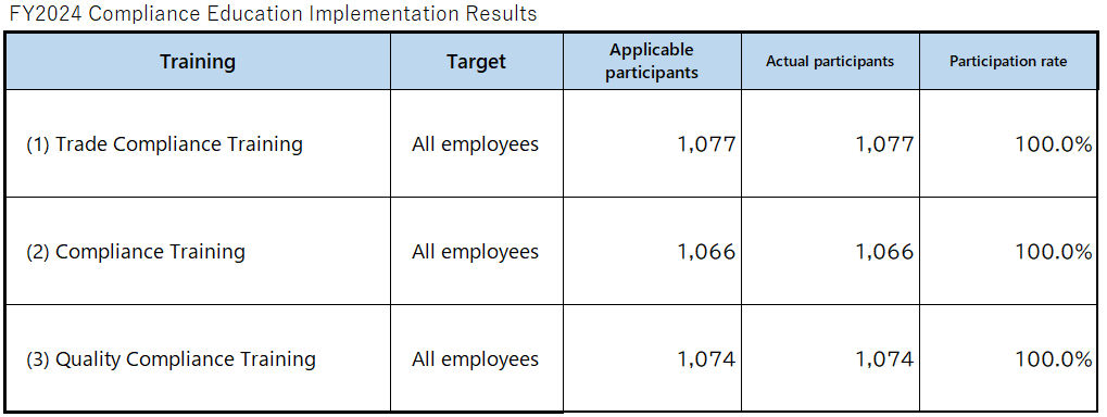 In FY2024, for employees, we conducted training on power, sexual, and other forms of harassment, and as e-learning, we conducted training on management of confidential information, personal information protection, prevention of bribery and corruption, as well as training regarding the Act on Prohibition of Private Monopolization and Maintenance of Fair Trade for our division heads and Sales Division.