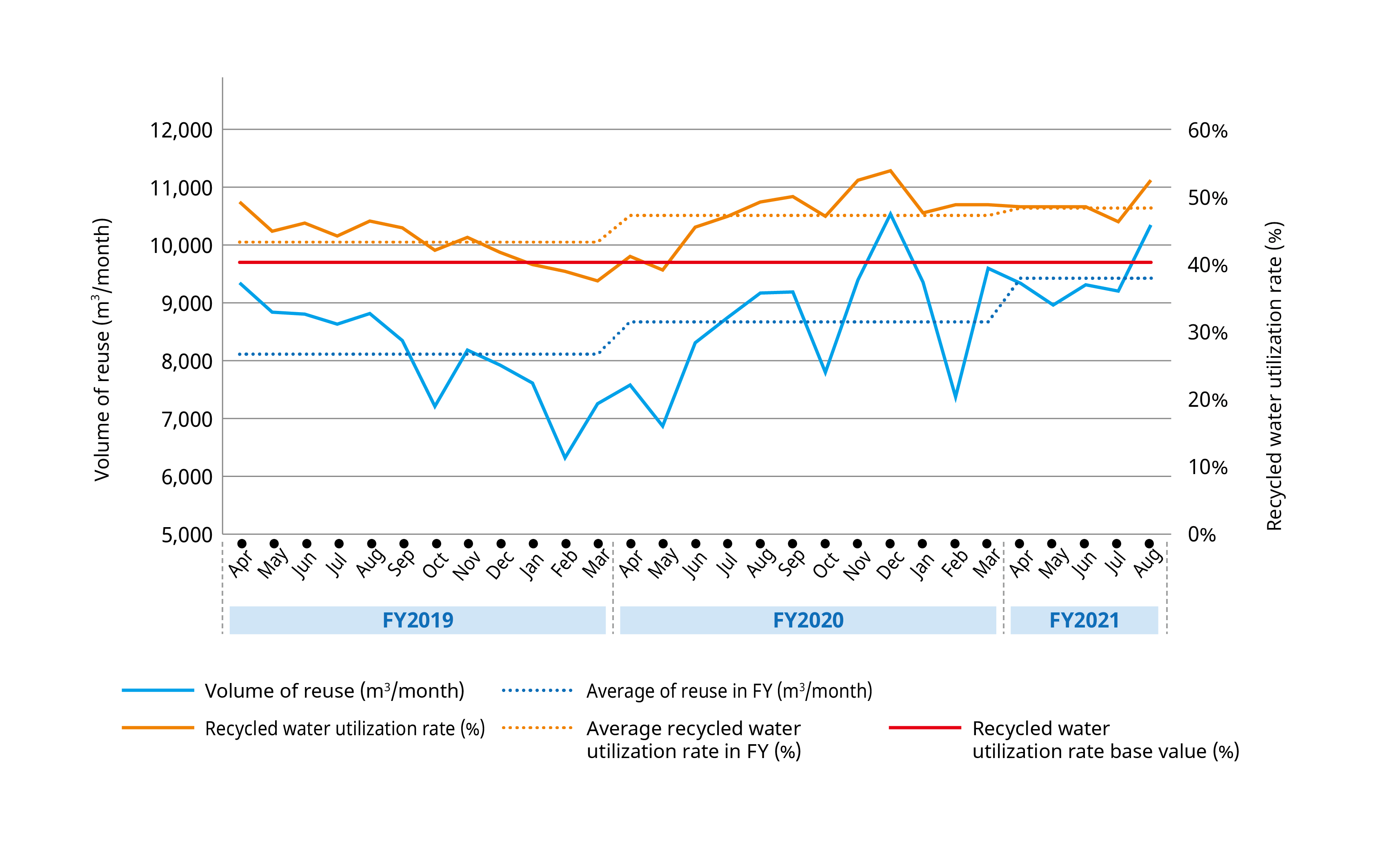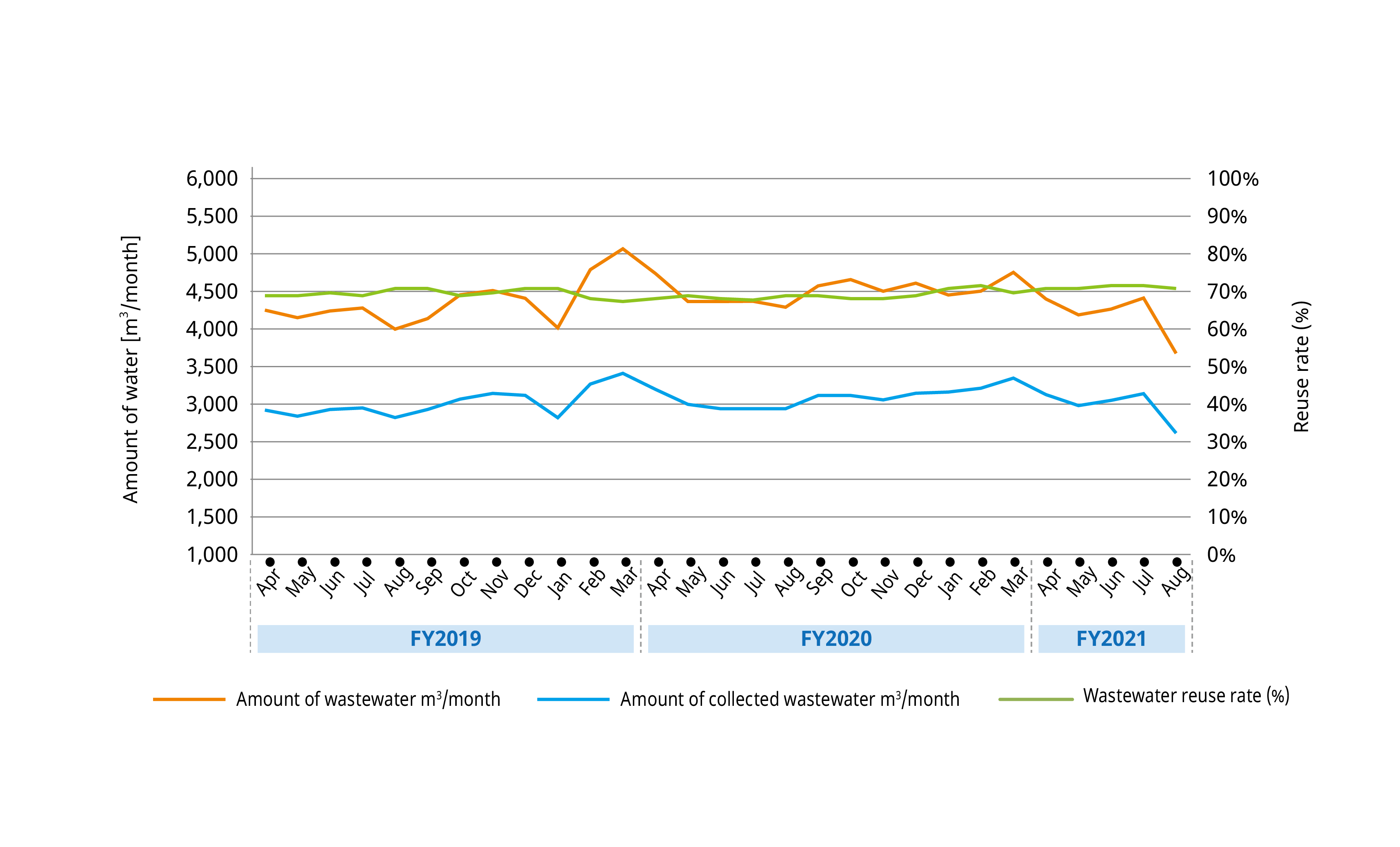 In terms of water reuse, we are working to improve the efficiency of waste water collection in production processes. The water reuse rate was 43.0% in FY2019, 47.2% in FY2020 and 47.5% in FY2021, demonstrating an annual improvement in the percentage of water reused. Through these efforts, we are aiming to continuously maintain a water recycling rate of at least 40.0%.
