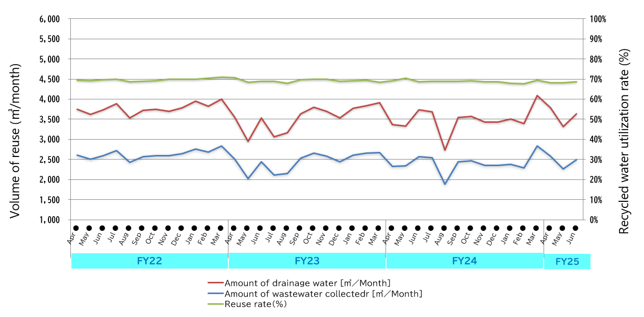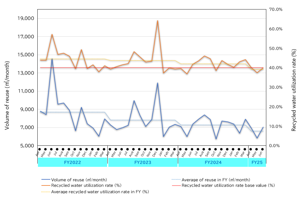 In terms of water reuse, we are working to improve the efficiency of waste water collection in production processes. The water reuse rate was 44.5% in FY2022, 43.7% in FY2023, and 42.0% in FY2023. Through these efforts, we are aiming to continuously maintain a water recycling rate of at least 40.0%.