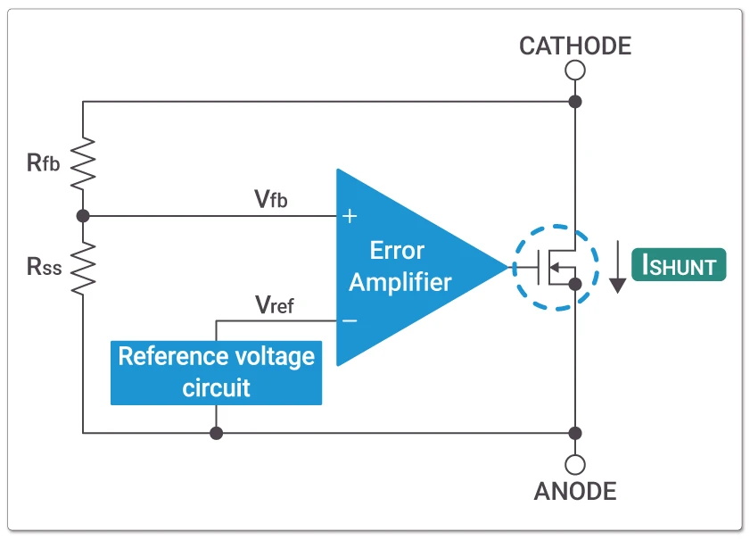 For example, if the load current (ILOAD) connected to VOUT (CATHODE) increases and VOUT decreases, the feedback voltage Vfb, divided by Rfb and Rss, also decreases. The error amplifier then controls the output transistor to reduce ISHUNT, causing VOUT to rise. Through this mechanism, a constant VOUT is continuously maintained.