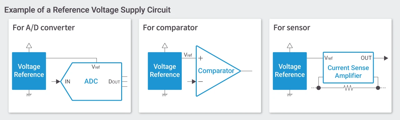 Voltage references are widely used as the reference voltage sources for components requiring high-precision, such as A/D converters (ADC), comparators, and sensors, as shown in the figure below.