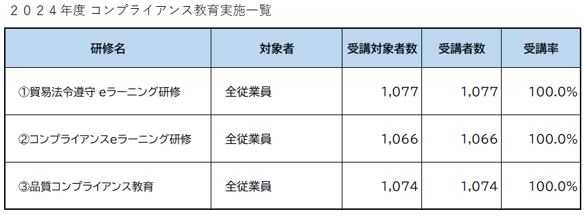 2024年度には、従業員を対象に実施したパワーハラスメント、セクシャルハラスメント等その他ハラスメント、eラーニングとして実施した機密情報管理、個人情報保護、贈収賄腐敗防止、部門長とセールス部門を対象にした独占禁止法に関する研修を実施しました。