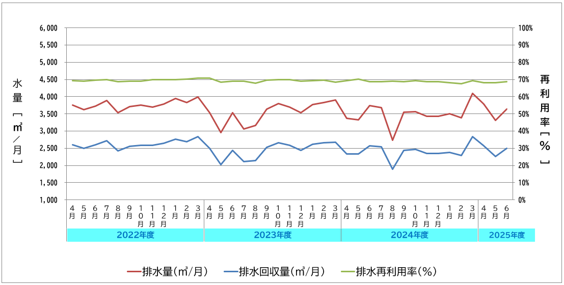 現在、装置排水の再利用率は70%前後を維持しており、排水リサイクル装置の最適運用による再利用率の向上に取り組んでいきます。