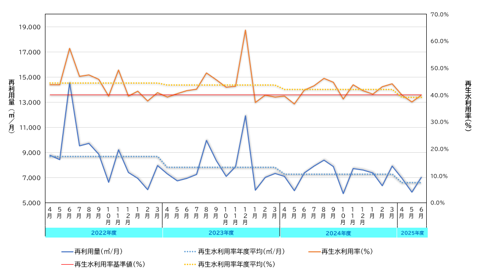再生水利用率基準値を40%とし、再生水利用率を毎月集計してその推移を確認しています。